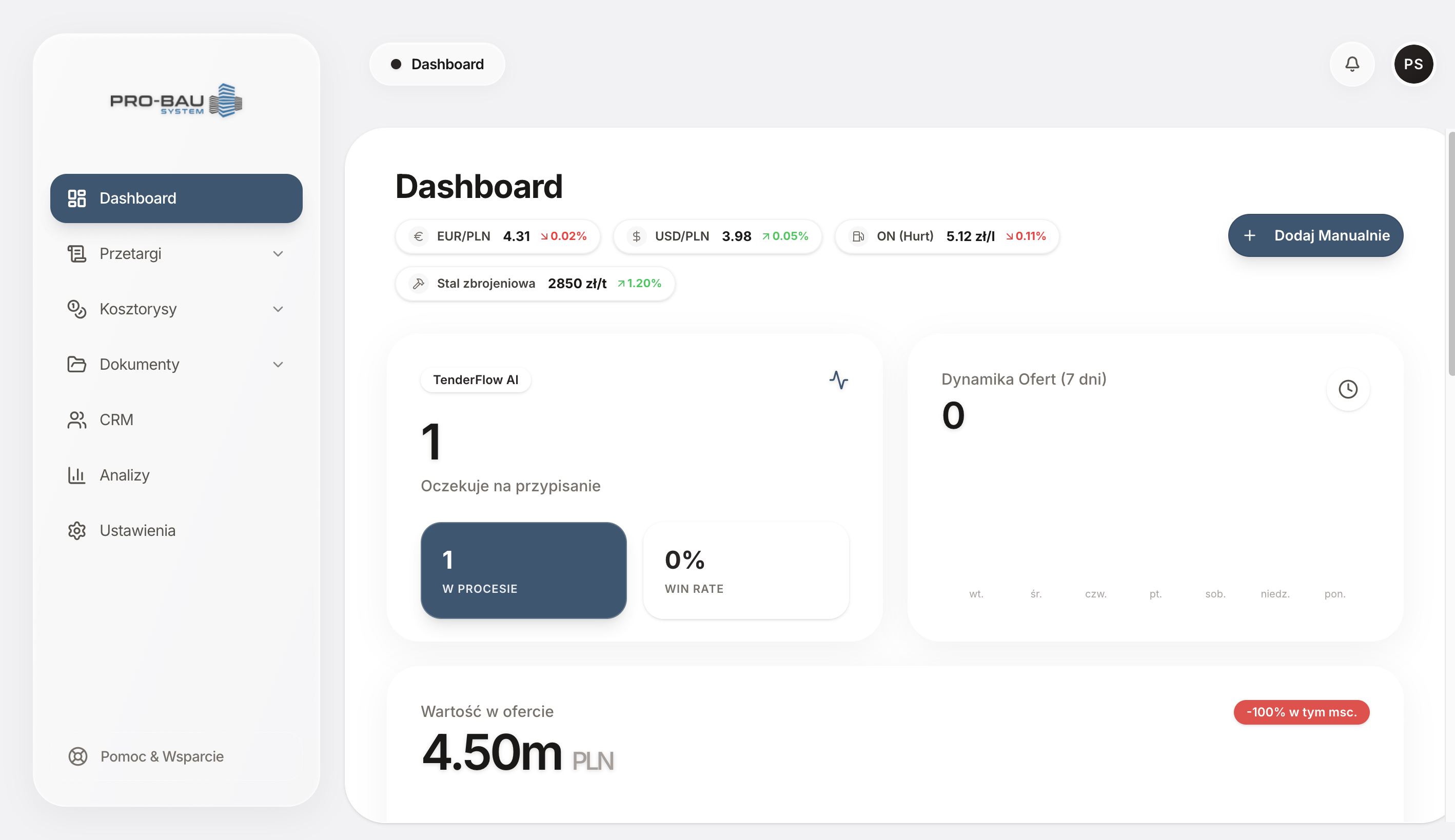 Dedykowana aplikacja dla firm budowlanych — agregacja przetargów publicznych, analiza AI dopasowania do profilu firmy, zarządzanie ofertami i pipeline sprzedażowy. Jedno miejsce dla całego procesu przetargowego.